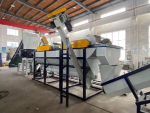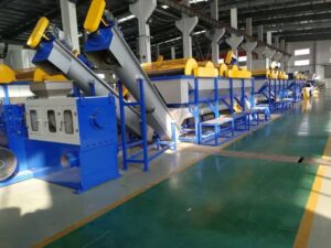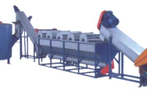 Conveying PET bottle→lable remover→ manual sorting table → wet crusher→screw loader →Hot washer→screw loader→high speed friction washer→screw loader→floating washer→screw loader→spray washer → dewater machine → pipe line dryer → label seperator → blower → hopper