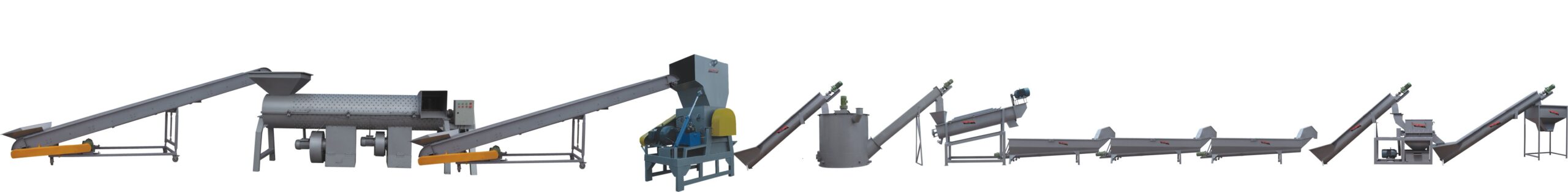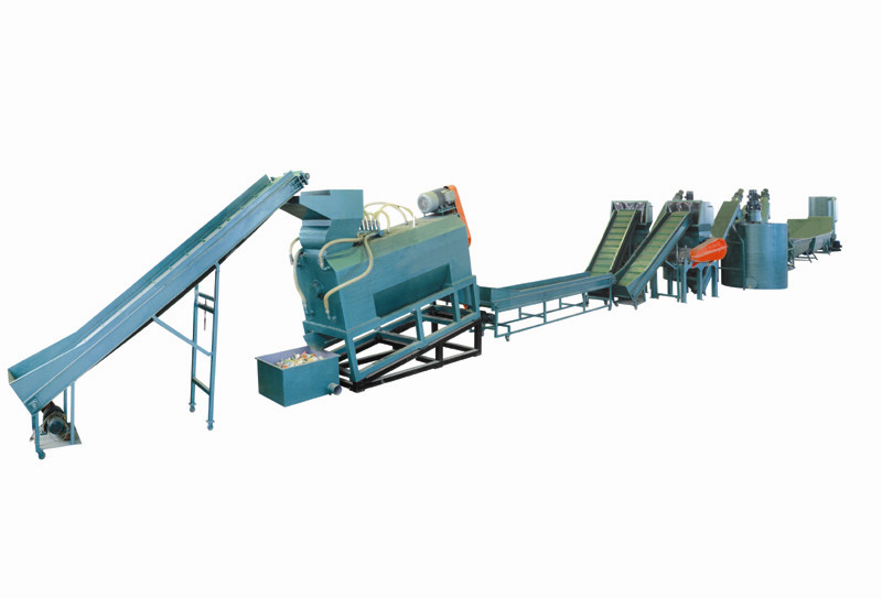 Conveying PET bottle→lable remover→ manual sorting table → wet crusher→screw loader →Hot washer→screw loader→high speed friction washer→screw loader→floating washer→screw loader→spray washer → dewater machine → pipe line dryer → label seperator → blower → hopper